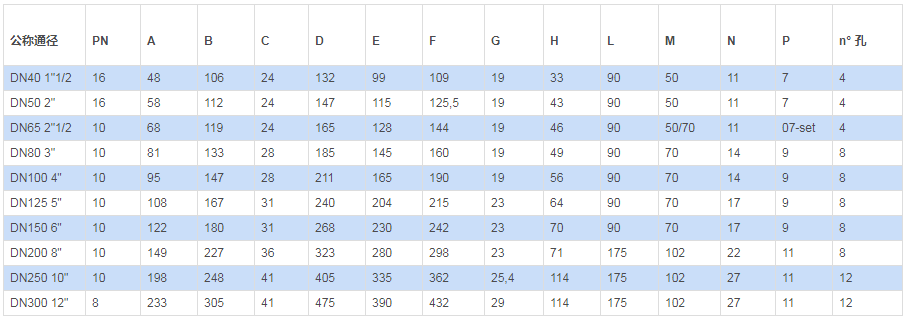 | 公稱通徑 | DN 40??1"1/2 | DN 50?2" | DN 65?2"1/2 | DN 80?3" | DN 100?4" | DN 125??5" | DN 150??6" | DN 200?8" | DN 250?10" | DN 300?12" |