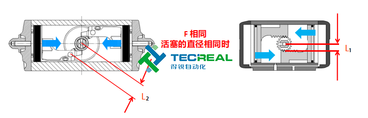 第二步,我們看兩者在扭矩轉(zhuǎn)換時(shí)的半徑。上圖為兩者工作時(shí)扭矩轉(zhuǎn)換半徑示意圖,左邊為撥叉式結(jié)構(gòu),右邊為齒輪齒條式結(jié)構(gòu)。從圖中顯示的“L”值可以看到,左邊在進(jìn)行扭矩轉(zhuǎn)換時(shí),L值會(huì)變大,而右邊的齒輪齒條式則是永遠(yuǎn)不變。經(jīng)過(guò)我們的測(cè)試,在活塞直徑相同的時(shí)候,OMAL的撥叉式氣動(dòng)執(zhí)行器比普通的齒輪齒條式氣動(dòng)執(zhí)行器的扭矩大40%左右。