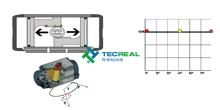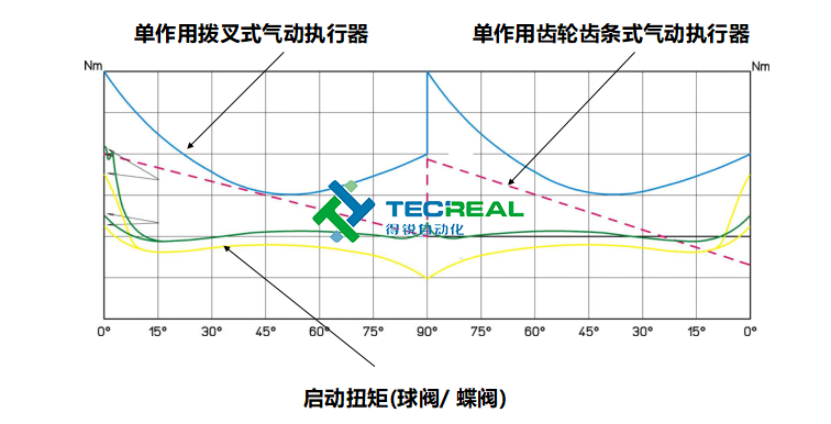 第三步,我們看兩者在輸出扭矩時(shí)的變化。圖1是撥叉式執(zhí)行器工作時(shí)扭矩變化圖,圖2位齒輪齒條式工作時(shí)扭矩變化圖??梢钥吹綋懿媸綒鈩?dòng)執(zhí)行器在開(kāi)啟和關(guān)閉時(shí)扭矩蕞大,而齒輪齒條式輸出的扭矩則是一成不變的。學(xué)過(guò)物理的都知道,物體由靜止變?yōu)檫\(yùn)動(dòng)狀態(tài)時(shí),需要克服的摩擦力蕞大,相應(yīng)就要需要輸出蕞大的力。