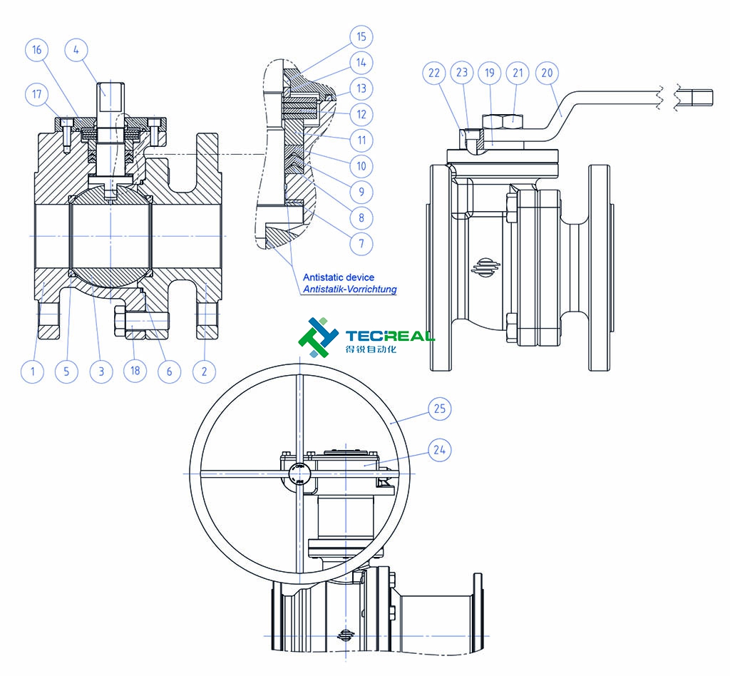 3.防靜電裝置(球體、閥桿和閥體間存在常電):此裝置可以避免在易燃或易爆環(huán)境中靜電荷的聚集。閥門在整個(gè)壽命周期中的接觸安全均具有保障。