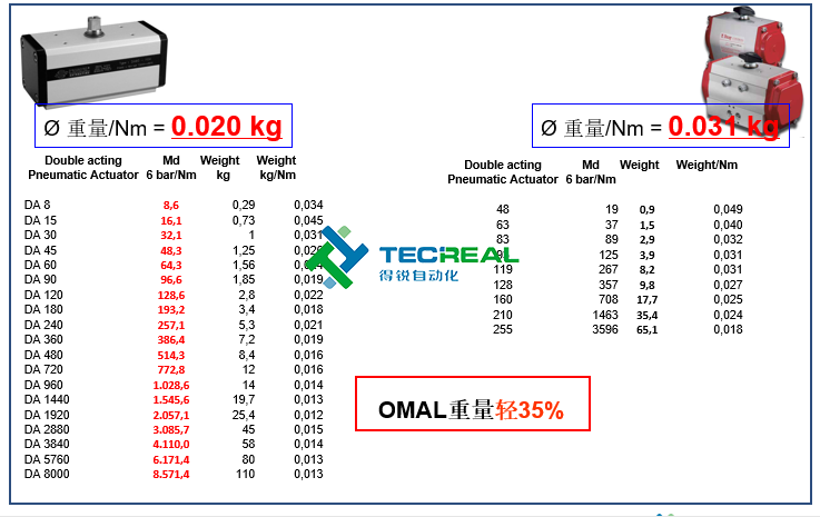 同樣我們先看雙動(dòng)型,OMAL的? 重量/Nm = 0.020 kg,而B(niǎo)ray? 重量/Nm = 0.031 kg,從上面的結(jié)果可以看出,OMAL撥叉式氣動(dòng)執(zhí)行器重量比對(duì)方輕35%。重量輕,則代表體積也小,那么在客戶(hù)安裝和維修的時(shí)候也會(huì)更加方便。