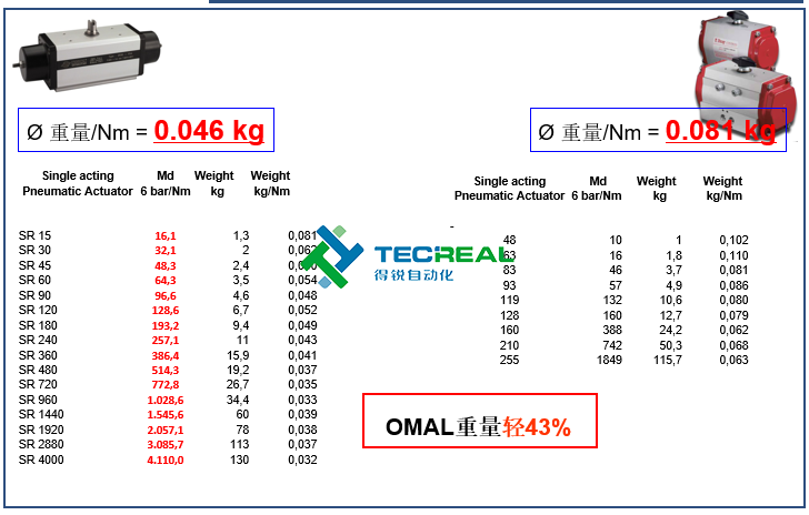 我們?cè)倏纯措p方的單動(dòng)型氣動(dòng)執(zhí)行器在重量上的表現(xiàn),從圖中可以看到,OMAL的? 重量/Nm = 0.046 kg,Bray? 重量/Nm = 0.081 kg,OMAL的重量則要比對(duì)方輕43%。