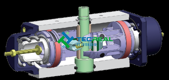 撥叉式氣動執(zhí)行器不僅符合防爆要求,而且體積小,重量輕,扭矩大,因其采用了獨(dú)特的“單氣缸雙活塞-撥叉式變扭矩”傳動結(jié)構(gòu)設(shè)計(jì)。
