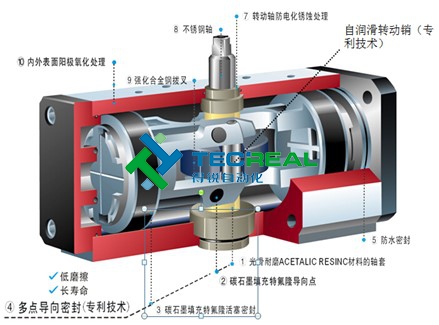 壓縮空氣進(jìn)入氣缸,推動(dòng)齒條式活塞直線運(yùn)動(dòng),齒條與齒輪軸上的齒輪嚙合帶動(dòng)齒輪軸旋轉(zhuǎn)運(yùn)動(dòng)從而實(shí)現(xiàn)對(duì)閥門的控制。