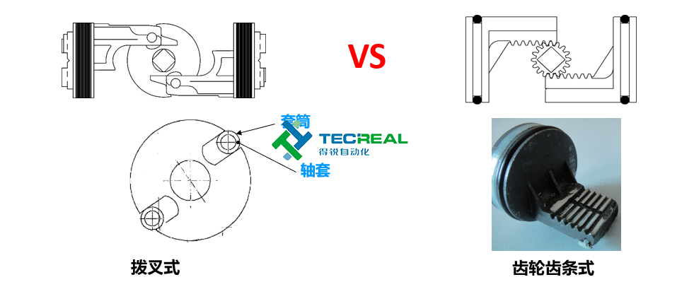 普通齒輪齒條式氣動執(zhí)行器為齒條間滑動摩擦,阻力大,容易造成磨損。而OMAL的氣動執(zhí)行器采用撥叉式結構,是軸套與套筒之間為滾動摩擦,阻力小。