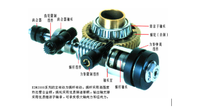 多級齒輪和蝸輪蝸桿傳動結(jié)構(gòu),蝸桿采用高強度熱處理合金鋼,渦輪采用優(yōu)質(zhì)鑄造青銅,輸出軸支撐采用優(yōu)質(zhì)錐滾子軸承,可承受極大軸向力和徑向力,傳動更加精確。