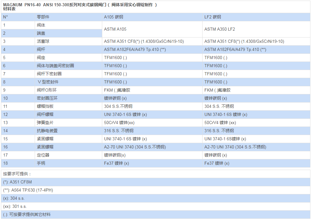 材料及等級(jí):對(duì)ANSI 美標(biāo)閥門(mén),符合ASME B16.34 標(biāo)準(zhǔn);對(duì)PN 公稱(chēng)壓力閥門(mén),符合EN12516 標(biāo)準(zhǔn)