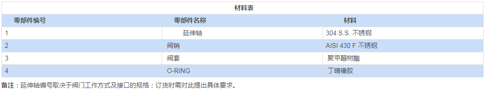 采用材料(用于閥體/活塞球/閥桿)與標(biāo)準(zhǔn)配置不同的參數(shù)要求,請(qǐng)與我們的銷售部門聯(lián)系