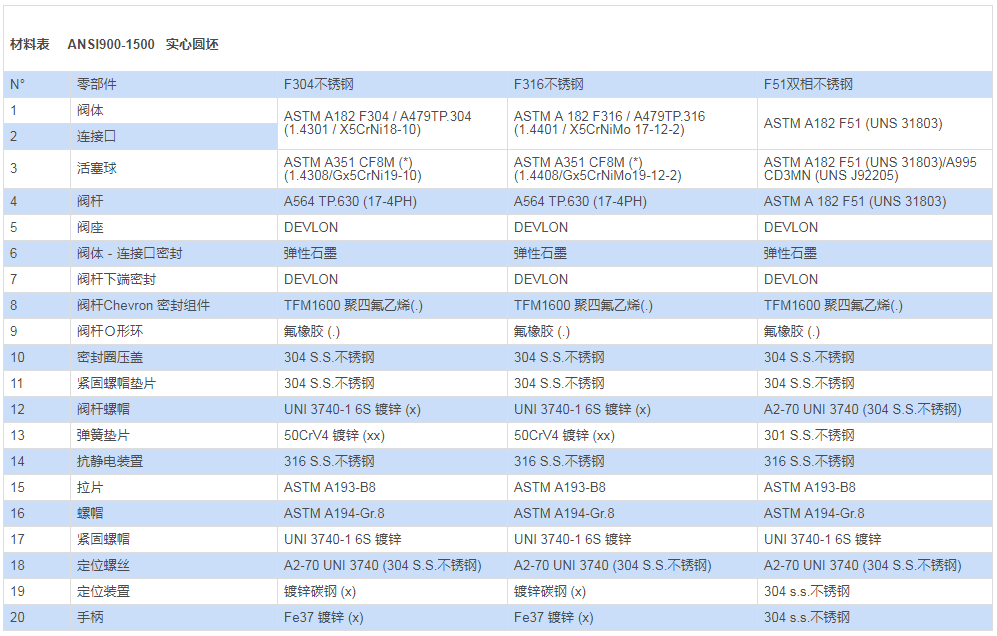 采用材料(用于閥體/活塞球/閥桿)與標(biāo)準(zhǔn)配置不同的參數(shù)要求,請與我們的銷售部門聯(lián)系